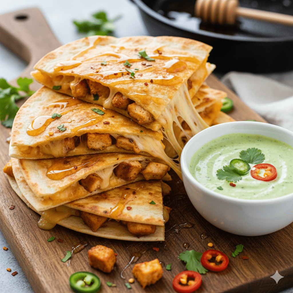 Cheesy Hot Honey Chicken Quesadillas with Spicy Jalapeño Cream Sauce